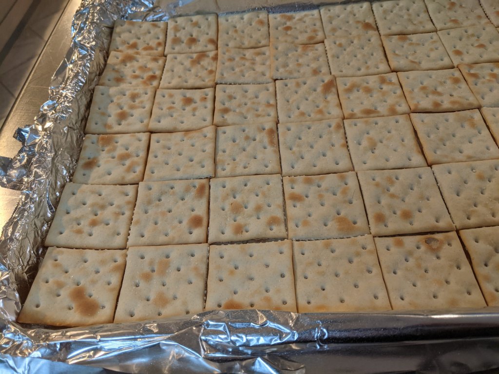 - Carefully remove the baking sheet from the oven, keeping it as flat as possible. Use the tip of a knife to straighten the crackers if they have moved.