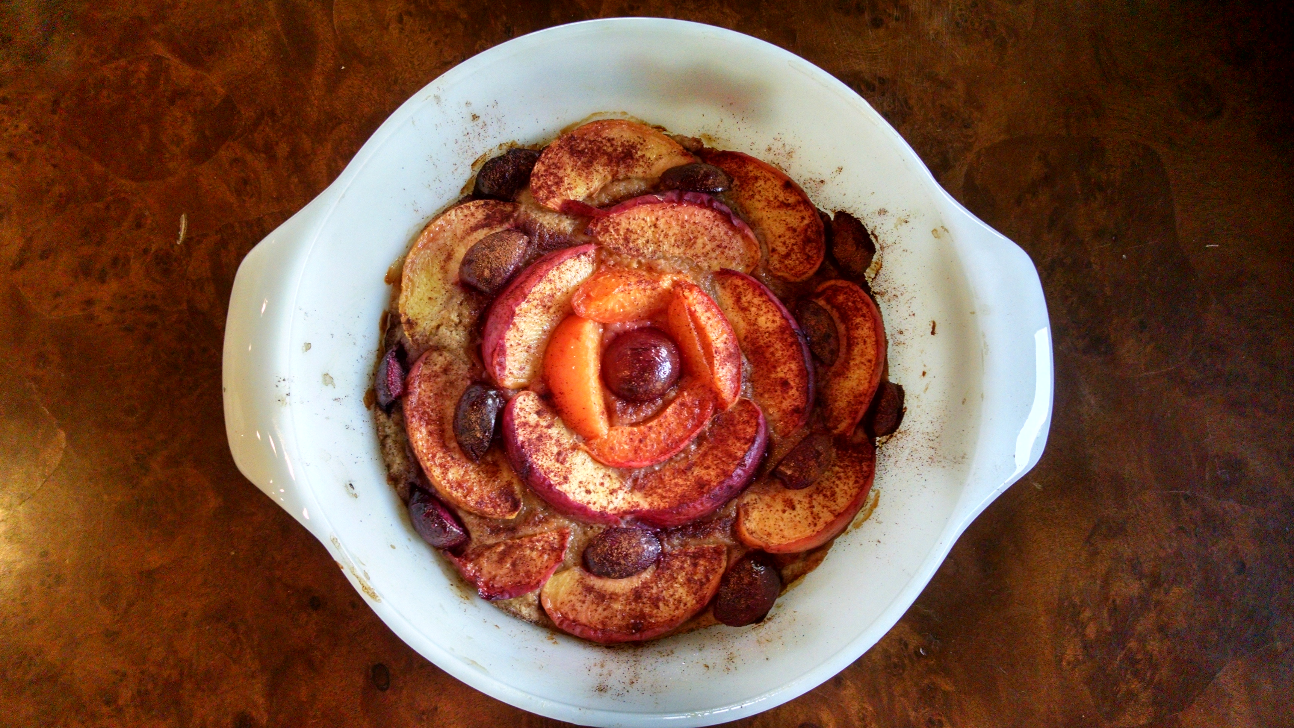 Nobody in my family spoke German from the time my great-grandparents died until my son moved to Berlin, but that heritage remains in expressions like nichts fur Kinder (not for children) and recipes like this one. It’s basically two steps: A bottom cake layer and a topping of fruit, all baked at once. Ideally, it’s served warm but room temperature works, too. Originally, I planned to just use a layer of sliced peaches, but my daughter took one peach for lunch and the other one turned to mush when I tried to slice it. So I dug around in the refrigerator and came up with one peach, one apricot, and several cherries. Feel free use whatever fresh fruit you have on hand.