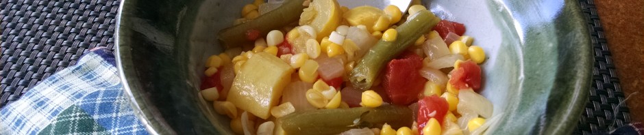 I found an Old California variation of succotash named Colache in American Harvest: Regional Recipes for the Vegetarian Kitchen by Nava Atlas (1987). The chile peppers – something the Pilgrims never ate – underscore the recipe’s migration into a new region. I wanted to try this version because it doesn’t contain the milky sauce that my sister and I dreaded in our “sufferin’ succotash” days. This colorful mix (quintuple succotash!) lives up to its promise to celebrate the summer harvest. It’s designed to be served hot, but I ended up serving it at room temperature, which worked better on a warm night. My mother would be proud of me for voluntarily eating a bowlful.