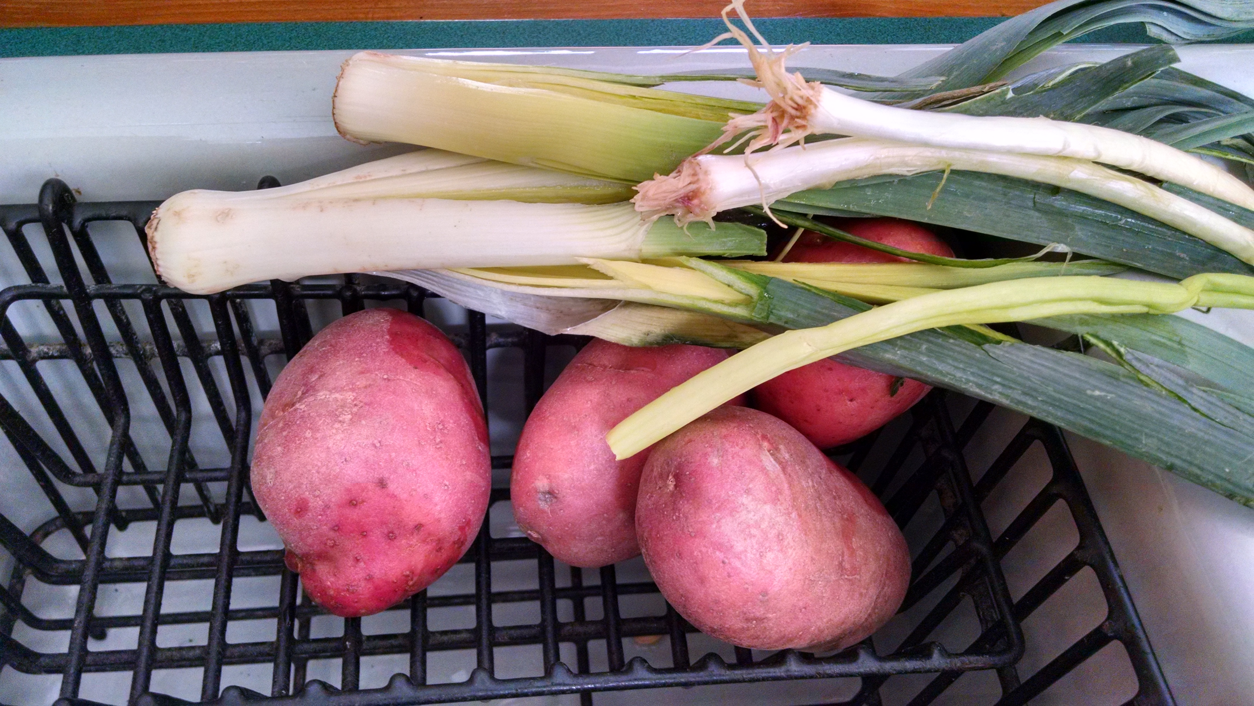 1. In a large pot, bring the water to a boil. Add the potatoes, bread and leeks.
