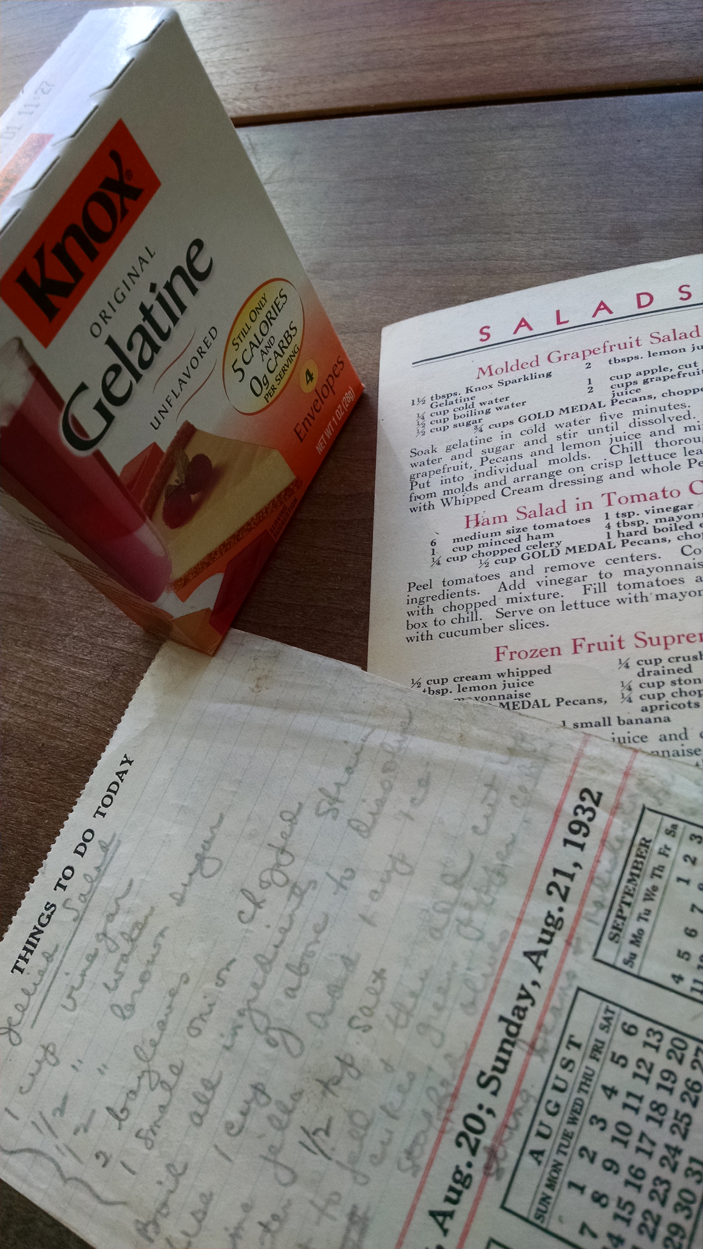 I found a new trove of my grandmother’s hand-written recipes, tucked into a Royal Baking Powder cookbook. Gelatine salads, here I come!