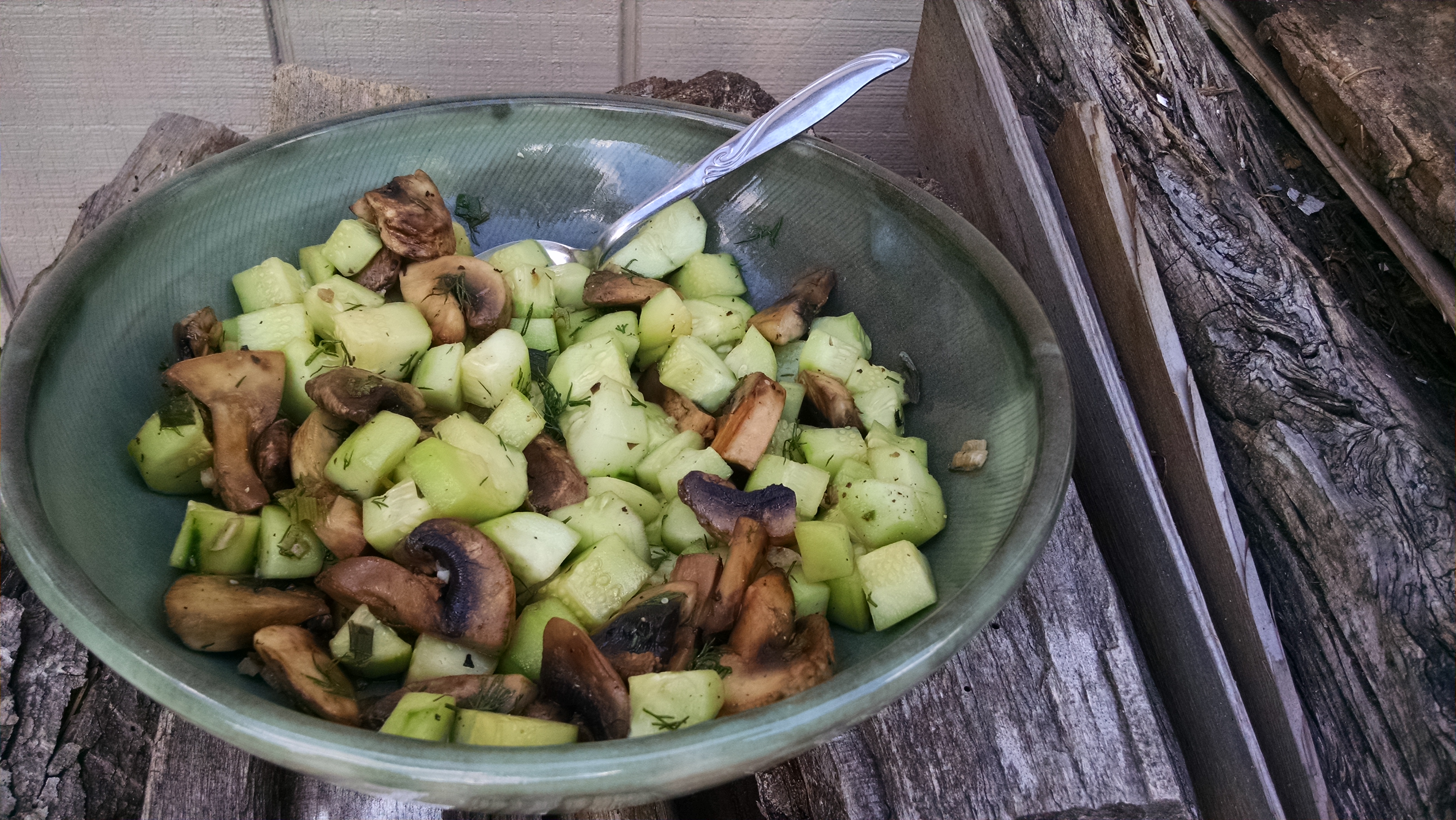 When someone left a box of free garden-grown vegetables in the plaza at Chautauqua, I couldn’t resist stashing a few in my bag. Grateful that a generous stranger shared the August bounty, I challenged myself to do more than slice the cucumbers into a salad. The Cucumber Sauté recipe in the Eating Healthy Cook Book (Better Homes and Gardens, 1986) came together quickly enough to avoid steaming up my kitchen – and gave me an unexpected way to use this member of the cucurbitaceae (also known as gourd) family. The cucumbers remained slightly crunchy and made a refreshing counterpoint to the mushrooms and onions. I let everything cool to room temperature before serving it as a side dish.